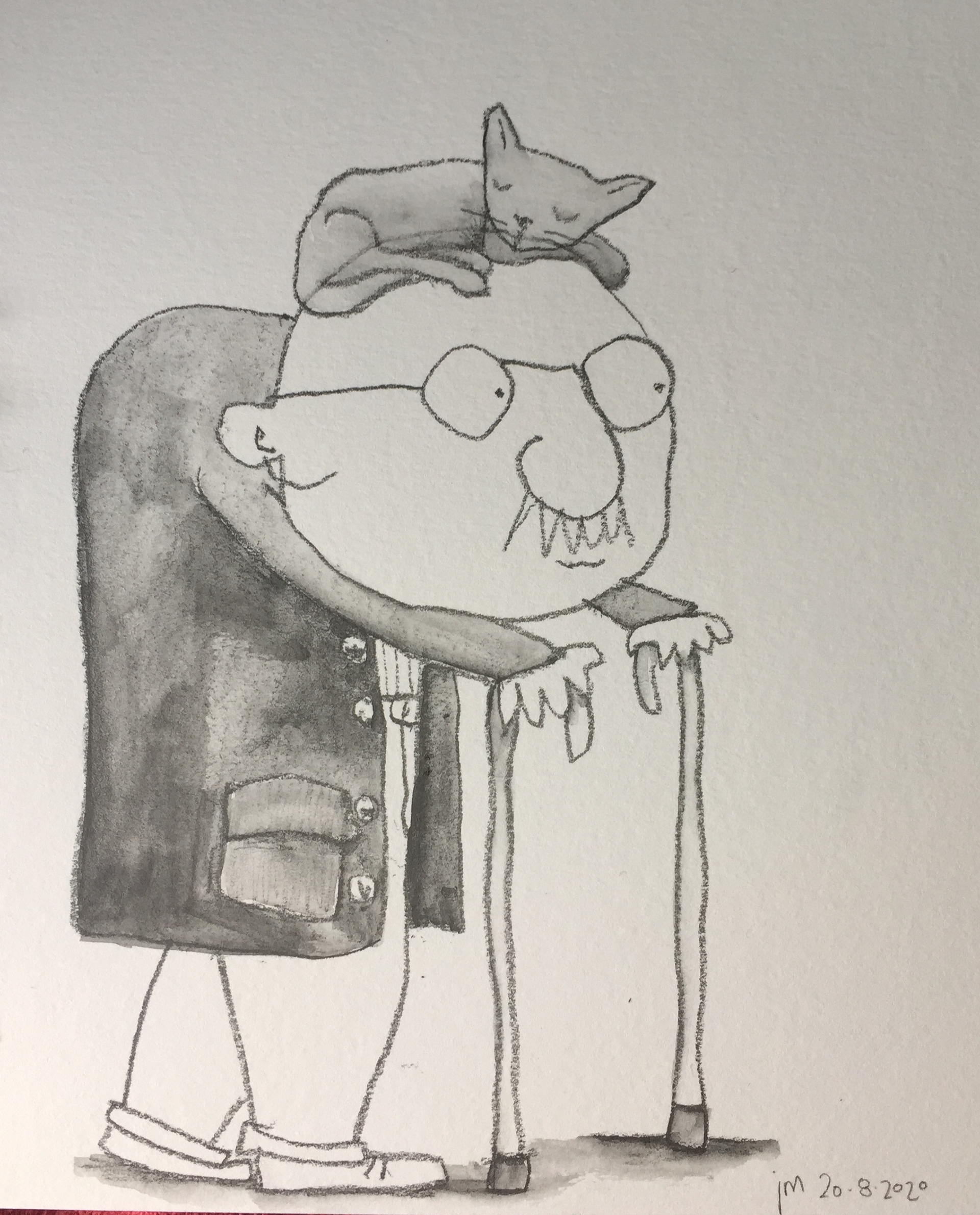 For my old man I lightened my sketch picture slightly, using only the edit setting on my iPad photos, then imported into Fresco. I didn't want to re-draw him as I had with Marcie because I like the smudgy texture on his jacket. I used a mask to cover the edges of my imported picture. On a new layer I made shapes, as I had for Marcie, in order to create a clipping mask. On the layer above I drew the stripes of his jacket and clipped it with a multiply blend mode. The sketch layer is on top also set to multiply.